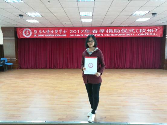 2月20日,“張原天博士獎學金”2017年春季捐助儀式在欽州市總工會舉行。我場文利分場僑眷李世秀同學獲得該項獎學金2000元。李世秀同學是文利分場歸僑黎瑞娟的女兒,學習成績優秀,現就讀廣西中醫藥大學。家庭共有4人,父親患有肺結核病,幾乎喪失勞動能力;母親是精神病患者,生活不能自理;妹妹在上學。一家四口沒有經濟來源,僅靠低保維持基本生活,兩姐妹的讀書費用一直靠貸款、打假期工和親戚朋友資助。獲得獎學金資助,一定程度緩解了李世秀同學的生活困難。她表示一定會努力學習,學成後做一個對社會有用的人。(本文轉載自文利分場)