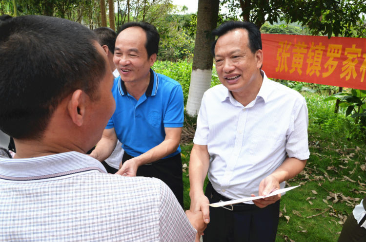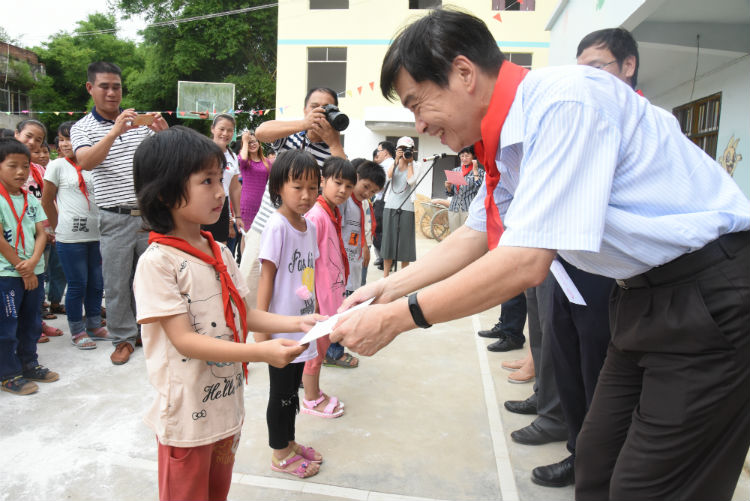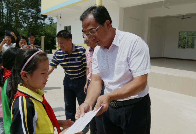 5月31日,市政協副主席陸崇友(右一)到浦北縣張黃鎮羅家村小學開展2017年張原天博士獎學金春季學期捐助儀式。 陳國明 攝。
