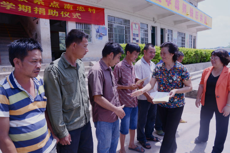 5月31日,市政協副主席羅志芳(右二)到欽北區新棠鎮南忠村小學開展2017年張原天博士獎學金春季學期捐助儀式。 陳就邦 攝。